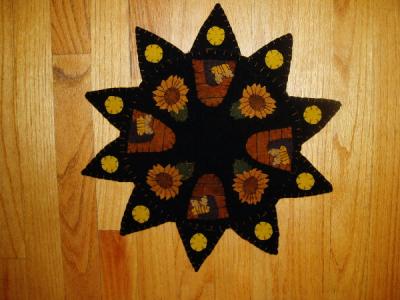 Here is another wool piece to add to your bee collection! My hand dyed wool candle mat is approx 10" in diameter and fits nicely on any table. I have backed this piece in 100% cotton, signed, and dated it for authenticity. Shipping is FREE