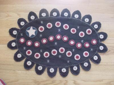 Here is another Americana version of a penny rug mat. This one is approx 18" by 26" in size and is hand stitched with wool thread on hand dyed wool in prim americana colors. I backed this in 100% cotton fabric, signed, and dated it for authenticity. Shipping is included in the cost.