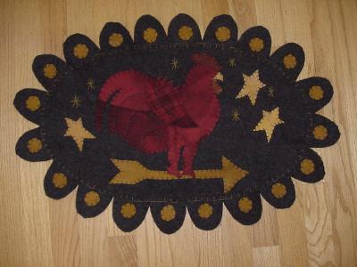 Rise and Shine crows this gallent ghent! My red rooster penny rug mat is approx 18" by 26" in size. Made entirely of hand dyed wool in prim colors and stitched with wool thread, I have backed this mat with 100% cotton, signed, and dated it for authenticity. Shipping is FREE. This mat is sure to add conversation to your morning breakfast table.