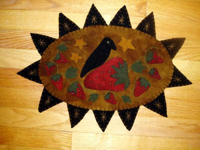 This primitive crow is enjoying the fruits of the strawberry patch! My hand dyed wool penny rug is approx 13" by 18" in size. I have handstitched the design on with wool thread, then backed it in cotton fabric, signed, and dated it for authenticity. Shipping is FREE