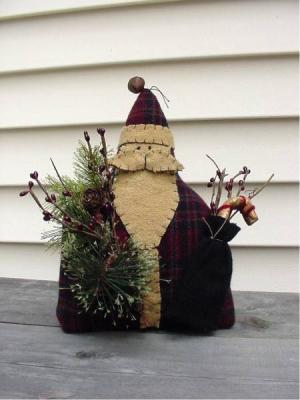 This prim santa is made of a deep red wool plaid and features a dirty white wool beard, face, and mustache as well as the trim on the hat and coat. Plenty of greens on one side with pip berries, and a black wool bag that holds some berries and a grungy candy cane inside. Santa sits nicely on any table, in a basket with greens and pinecones and placed on a hearth, or on a window sill. The size is approx 8" wide by 10" high. Makes a wonderful gift as well. Shipping is included in cost.