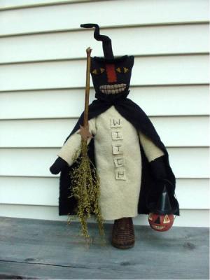 This is a wonderful piece!! Large in size, approx 25" tall, this cat doll sits on an antique beehive bobbin. Made entirely of hand dyed wool and stitched in penny rug fashion, one hand holds a broom of preserved sweet annie and the other holds a primitive paper mache pumpkin witch. Sit this on any table. Design is by Sew Prim Patterns! Shipping is included in cost.