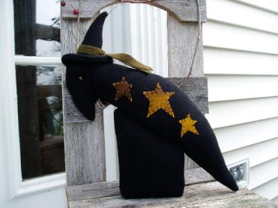 This crow is dressed for the spooky season with a removeable hat. Sitting on a sand weighted wool post, caw measures approx 6" by 16". Made entirely of hand dyed wool, it is visible on both sides so it makes a terrific display on a window sill. Shipping and handling are included with price.