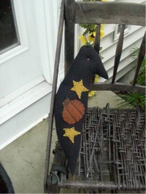 This handsome ghent is decked out for the fall with his pumpkin and two stars. Made entirely of hand dyed wool, the size is approx 4" wide by 15" long. A rusted tin wire is attached for hanging off any door knob or peg hook! Dress up your primitive home with a woolly crow! Shipping and handling is included in the cost.