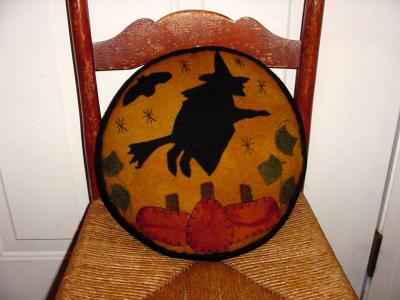 Here is another screamer for the Halloween season! This witch is riding across the moon on her broomstick! Approx 12" in diameter, this piece is made entirely of hand dyed wool and edged with wool piping. A great additon to your fall decor. Add this to a grouping of pillows or set it alone on that special chair. Shipping and handling is included in the price.