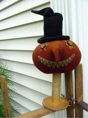 This JOL witch pumpkin sits atop a very old wood bobbin! He is made entirely of HAND DYED WOOL. A design/pattern by Hill Kountry Krafts, I have done this in primpeddler penny rug fashion. A great guy to place on any mantle, shelf, or table. The size is approx. 17" tall by 7" wide including the bobbin he sits on.