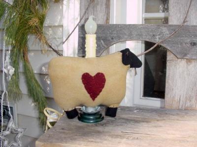If you love sheep, you will need this light to dress up your primitive/country home! Made of hand dyed wool and stitched in penny rug fashion, the 7" electric candle has an on and off switch for easy use and a silicone waxed bulb for that prim look. The sheep is approx 5" by 6" and shipping is FREE