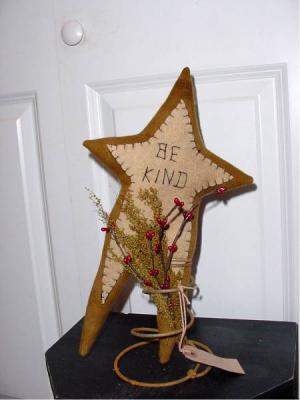 Another great star made entirely of hand dyed wool and stitched in penny rug fashion, this is perfect for any Folk Art Collector! The star sits nicely in an old rusted bedspring and is accented with sweet annie and pipp berries. Shipping is FREE