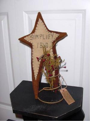 This hand dyed wool star features the words Simplify 1860 on it in wool thread. The star is stitched in penny rug fashion and sits in an old rusted bedspring. Shipping is FREE