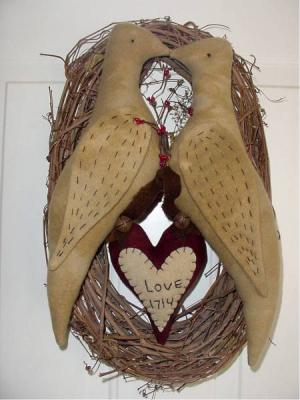 This beautiful piece is perfect for your door or wall! The grapevine wreath is approx 12" by 18" in size and the hand dyed wool birds with heart measure about 11" by 15". A design by Tennesse Ridge Primitives, we offer the finished product to you with shipping included in the cost!