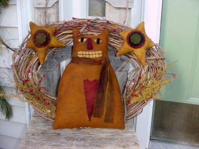 Here kitty, kitty! You will find this feline on our 12" by 18" grapevine wreath. The cat and stars are made of hand dyed wool in prim colors and the stars feature 3 layers of wool pennies stitched on top in wool thread. Shipping is included in the cost.